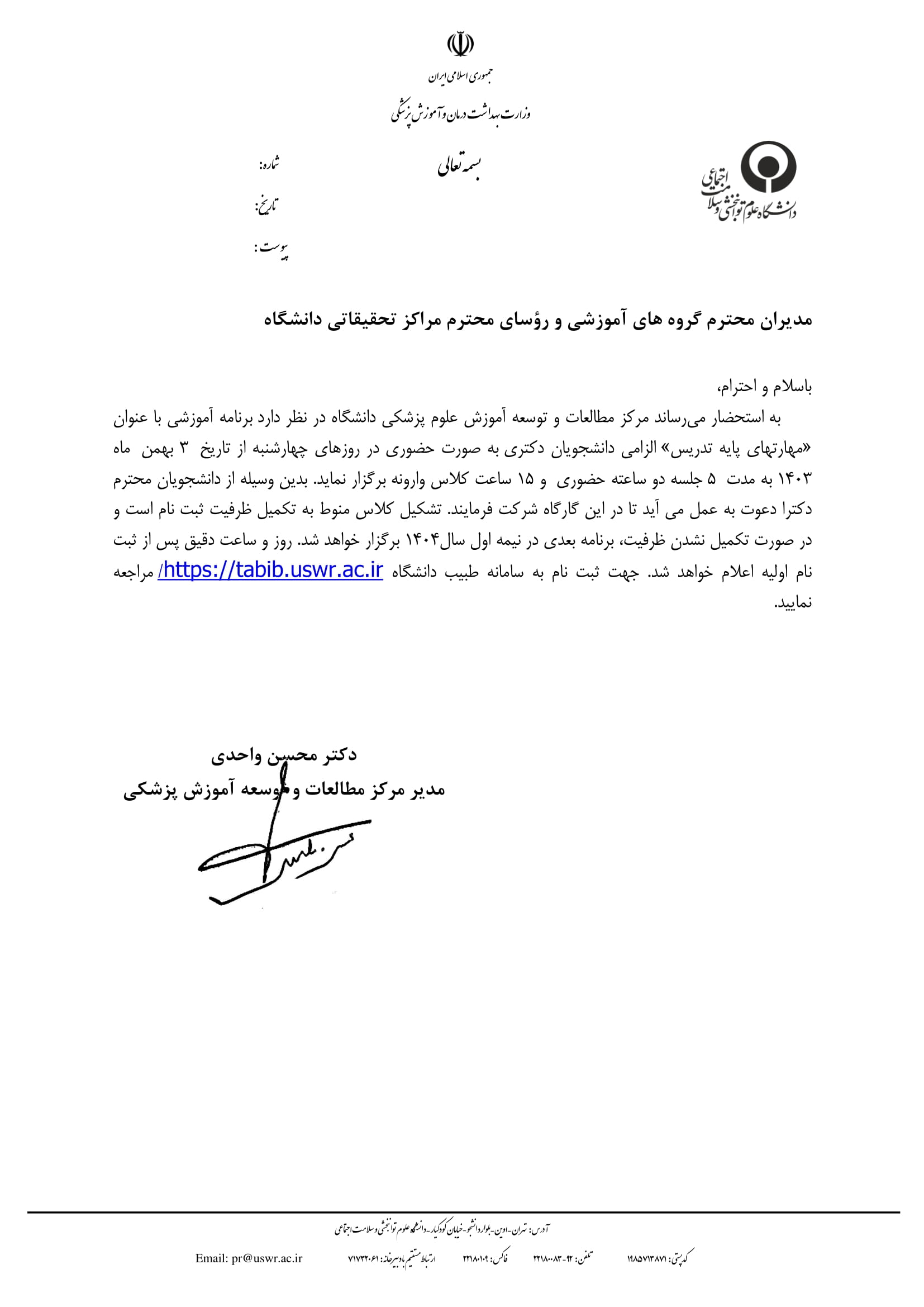 صفحه اصلی دانشگاهمعاونت آموزشیمعاونت پژوهشیمعاونت درمانمعاونت فرهنگی و دانشجوییکتابخانه مرکزیتماس با دانشگاه