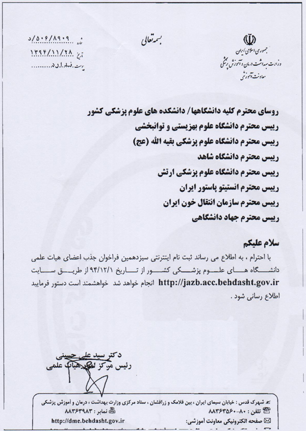 رییس مرکز امور هیات علمی وزارت بهداشت اعلام کرد: فراخوان جذب اعضای هیات علمی دانشگاه های علوم پزشکی کشور